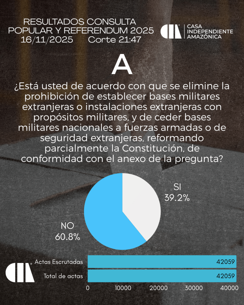 - 60,82 % votó No a eliminar la prohibición constitucional de instalar bases militares extranjeras en Ecuador.
