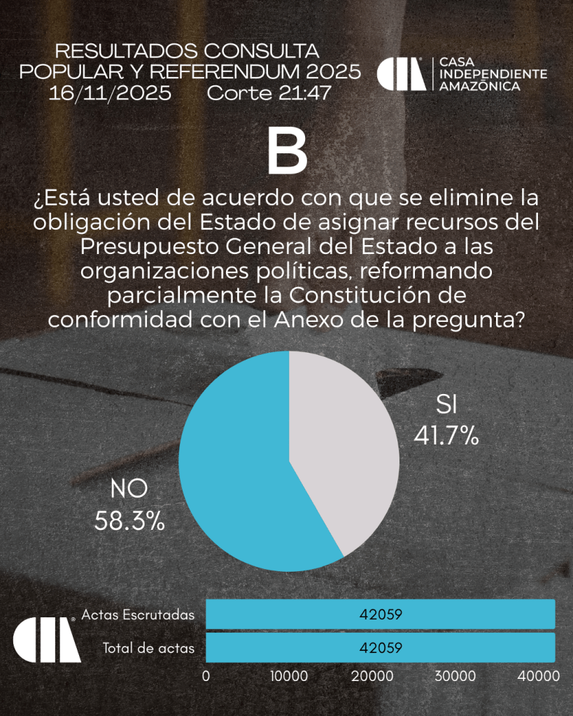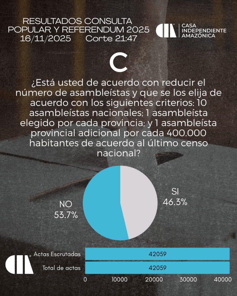 El Consejo Nacional Electoral (CNE) aprobó este miércoles 26 de noviembre los resultados del Referéndum y Consulta Popular del 16 de noviembre, en el que la opción No se impuso en las cuatro preguntas impulsadas por el presidente Daniel Noboa, incluida la propuesta de convocar a una Asamblea Constituyente para redactar una nueva Constitución.