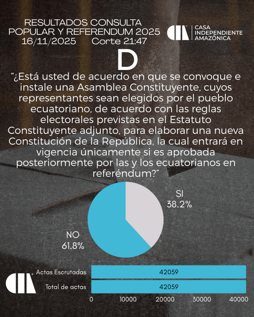 - 61,8 % rechazó la propuesta de instaurar una Asamblea Constituyente, iniciativa que buscaba reemplazar la Constitución vigente desde 2008.