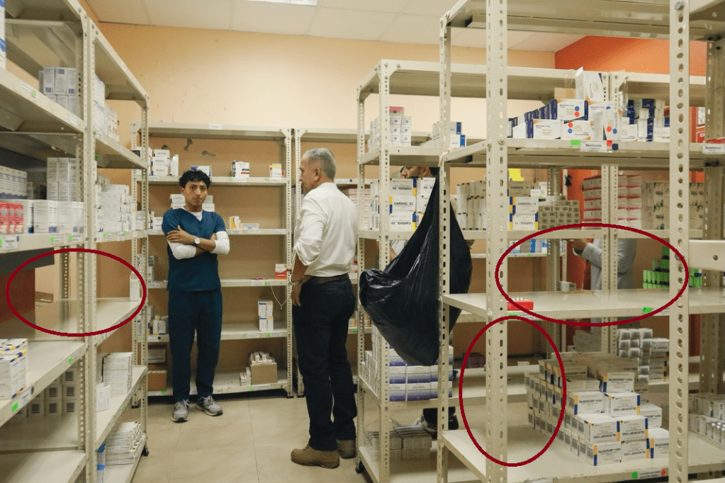 No obstante, imágenes difundidas por la propia Gobernación mostrarían perchas sin medicamentos, generando dudas.