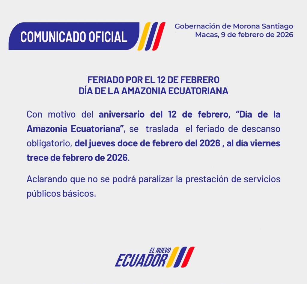 La región Amazónica contará con un feriado de cinco días consecutivos en febrero de 2026, tras el traslado del descanso obligatorio por el Día de la Amazonía Ecuatoriana y su coincidencia con el feriado nacional de Carnaval.