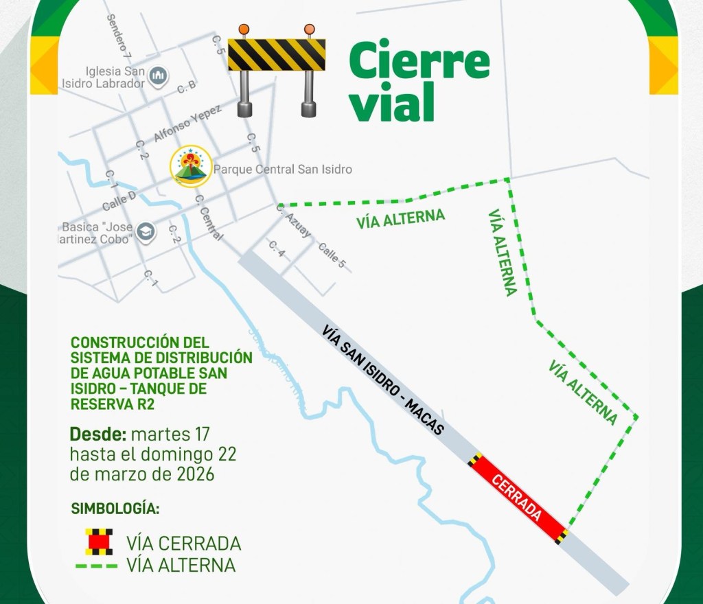 Debido a los trabajos para la construcción del sistema de distribución de agua potable San Isidro – Tanque de Reserva R2, se ejecuta el cierre temporal de un tramo de la vía que conecta a San Isidro con Macas.