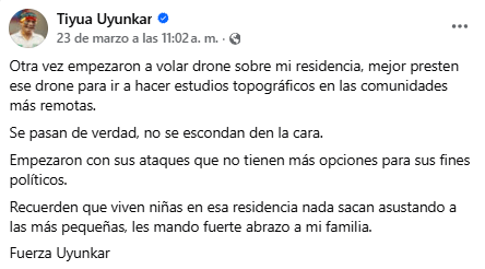 El 23 de marzo de 2026, el prefecto de Morona Santiago, Tiyua Uyunkar, denunció a través de sus redes sociales la presencia de drones sobre su residencia, señalando que se trataría de acciones con motivación política y expresando preocupación por la seguridad de su familia.