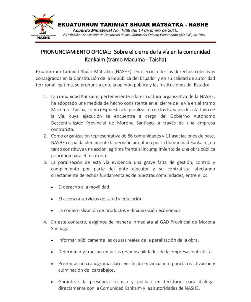 La organización Ekuaturnum Tarimiat Shuar Mátsatka (NASHE) se pronunció sobre el cierre de la vía en la comunidad Kankaim, en el tramo Macuma–Taisha, en la provincia de Morona Santiago.